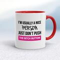 The Bitch Button Mug A rude mug with "I'm Usually A Nice Person Just Don't Push The Bitch Button" printed on both sides. Simple and straight to the point this rude mug is great as a gift for any...