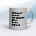 Whiskey Alpha Mug A rude mug with "Whiskey Alpha November Kilo Echo Romeo", from the NATO phonetic alphabet printed on both sides. Simple and straight to the point this rude mug is great as a g...