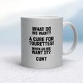 Cure For Tourettes Mug A rude mug with "What Do We Want? A Cure For Tourettes. When Do We Want It? Cunt" on both sides. Simple and straight to the point this rude mug is great as a gift for any ...