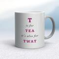 T Is For Tea It's Also For Twat MugA rude mug with 'T Is For Tea It's Also For Twat' printed on both sides. Simple and straight to the point this rude mug is great as a gift for any occasion.Our T...