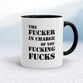 Fucker In Charge Mug A rude mug with "The Fucker In Charge Of You Fucking Fucks" printed on both sides. Simple and straight to the point this rude mug is great as a gift for any occasion. Our Fu...