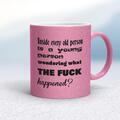 Inside Every Old Person Mug A rude mug with "Inside Every Old Person Is A Young Person Wondering What The Fuck Happened?" printed on both sides. Simple and straight to the point this rude mug is...
