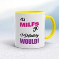 As MILFs Go Mug A rude mug with "As MILFs Go I Definitely Would!" printed on both sides. Simple and straight to the point this rude mug is great as a gift for any occasion. Our As MILFs Go mug i...