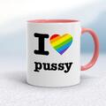 I Love Pussy Pride Mug A rude mug with "I Love Pussy" with a Pride rainbow heart printed on both sides. Simple and straight to the point this rude mug is great as a gift for any occasion. Our I ...