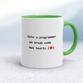 Date A Programmer Mug A geeky mug with "Date A Programmer We Break Code Not Hearts" printed on both sides. Simple and straight to the point this geeky mug is great as a gift for any occasion. Ou...