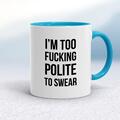 Too Fucking Polite Mug A rude mug with "I'm Too Fucking Polite To Swear" printed on both sides. Simple and straight to the point this rude mug is great as a gift for any occasion. Our Too Fuckin...