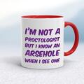I'm Not A Proctologist Mug A rude mug with "I'm Not A Proctologist But I Know An Arsehole When I See One" printed on both sides. Simple and straight to the point this rude mug is great as a gift...