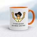 You Broke Something Mug A novelty mug with ""I'm Here Because You Broke Something" and an exasperated Moss like graphic The IT Crowd" printed on both sides. Simple and straight to the point th...