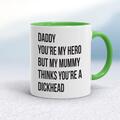 Daddy You're My Hero Mug A rude mug with "Daddy You're My Hero, But My Mummy Thinks You're A Dickhead" on both sides. Simple and straight to the point this rude mug is great as a gift for any oc...