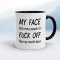 My Face Tells More People To Fuck Off Mug A rude mug with "My face tells more people to fuck off than my mouth does" on both sides. Simple and straight to the point this rude mug is great as a g...