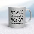 My Face Tells More People To Fuck Off Mug A rude mug with "My face tells more people to fuck off than my mouth does" on both sides. Simple and straight to the point this rude mug is great as a g...