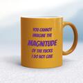 Magnitude of the Fucks Mug A rude mug with "You Cannot Imagine The Magnitude of the Fucks I Do Not Give" printed on both sides. Simple and straight to the point this rude mug is great as a gift ...