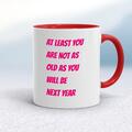 Not as Old As Next Year Mug A novelty mug with "At least you are not as old as you will be next year" on both sides. Simple and straight to the point this novelty mug is great as a gift for any ...