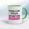 The Bitch Button Mug A rude mug with "I'm Usually A Nice Person Just Don't Push The Bitch Button" printed on both sides. Simple and straight to the point this rude mug is great as a gift for any...