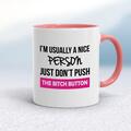 The Bitch Button Mug A rude mug with "I'm Usually A Nice Person Just Don't Push The Bitch Button" printed on both sides. Simple and straight to the point this rude mug is great as a gift for any...