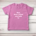 Ruined Your Boobs Baby T-ShirtOur rude baby t-shirt is printed with 'Mum, Sorry I Ruined Your Boobs' and is super snug and ultra comfy.Super soft and stretchy 100% cotton, short sleeve t-shirt wit...