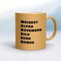 Whiskey Alpha Mug A rude mug with "Whiskey Alpha November Kilo Echo Romeo", from the NATO phonetic alphabet printed on both sides. Simple and straight to the point this rude mug is great as a g...