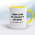 They Said It Couldn't Be Done Mug A novelty mug with "They Said It Couldn't Be Done So I Didn't Do It" printed on both sides. Simple and straight to the point this novelty mug is great as a gift...