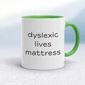 Dyslexic Lives Mattress Mug A novelty mug with "Dyslexic Lives Mattress" printed on both sides. Simple and straight to the point this novelty mug is great as a gift for any occasion. Our Dyslexi...