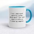 Unix Operating System Mug A geeky mug with "I use a UNIX based operating system, which means I get laid about as often as I reboot my computer" on both sides. Simple and straight to the point th...