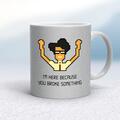 You Broke Something Mug A novelty mug with ""I'm Here Because You Broke Something" and an exasperated Moss like graphic The IT Crowd" printed on both sides. Simple and straight to the point th...