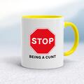 Stop Being A Cunt Mug A rude mug with "Stop Being A Cunt" printed on both sides. Simple and straight to the point this rude mug is great as a gift for any occasion. Our Stop Being A Cunt mug is ...