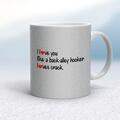 Back-Alley Hooker Mug A rude mug with "I love you like a back-alley hooker loves crack." printed on both sides. Simple and straight to the point this rude mug is great as a gift for any occasion...