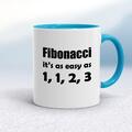 Fibonacci Mug A geeky mug with "Fibonacci it's as easy as 1, 1, 2, 3" printed on both sides. Simple and straight to the point this geeky mug is great as a gift for any occasion. Our Fibonacci mu...