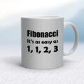Fibonacci Mug A geeky mug with "Fibonacci it's as easy as 1, 1, 2, 3" printed on both sides. Simple and straight to the point this geeky mug is great as a gift for any occasion. Our Fibonacci mu...