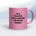 I'm A Teacher Mug A novelty mug with "I'm A Teacher Let's Assume I'm Never Wrong" printed on both sides. Simple and straight to the point this novelty mug is great as a gift for any occasion. Ou...