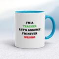 I'm A Teacher Mug A novelty mug with "I'm A Teacher Let's Assume I'm Never Wrong" printed on both sides. Simple and straight to the point this novelty mug is great as a gift for any occasion. Ou...
