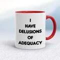 Delusions Of Adequacy Mug A geeky mug with "I Have Delusions Of Adequacy" printed on both sides. Simple and straight to the point this geeky mug is great as a gift for any occasion. Our Delusion...
