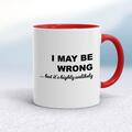 I May Be Wrong Mug A novelty mug with "I May Be Wrong... But It's Highly Unlikely" printed on both sides. Simple and straight to the point this novelty mug is great as a gift for any occasion. O...