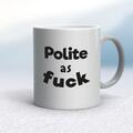 Polite As Fuck MugA rude mug with 'Polite As Fuck' printed on both sides. Simple and straight to the point this rude mug is great as a gift for any occasion.Our Polite As Fuck mug is hand-printed ...