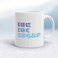 IDGAF Mug A novelty mug with "IDK, IDC, IDGAF" printed on both sides. Simple and straight to the point this novelty mug is great as a gift for any occasion. Our IDGAF mug is hand-printed on both...
