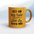Sit On My Face Mug A rude mug with "Sit On My Face" printed on both sides. Simple and straight to the point this rude mug is great as a gift for any occasion. Our Sit On My Face mug is hand-prin...