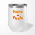 Polite As Fuck Wine TumblerOur Polite As Fuck 12oz tumbler is hand-printed with 'Polite As Fuck' on both sides (front/back) of an insulated stainless steel wine tumbler and available in a variety ...