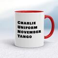 Charlie Uniform Mug A rude mug with "Charlie Uniform November Tango", from the NATO phonetic alphabet printed on both sides. Simple and straight to the point this rude mug is great as a gift for...