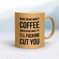 What Do We Want Coffee Mug A rude mug with "What Do We Want? Coffee When Do We Want It? I'll Fucking Cut You" printed on both sides. Simple and straight to the point this rude mug is great as a ...