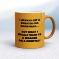 Sweater for Christmas Mug A rude mug with "I Always Get A Sweater for Christmas... But What I Really Want Is A Moaner Or A Grunter" printed on both sides. Simple and straight to the point this r...