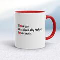 Back-Alley Hooker Mug A rude mug with "I love you like a back-alley hooker loves crack." printed on both sides. Simple and straight to the point this rude mug is great as a gift for any occasion...