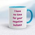Negative Bullshit Mug A rude mug with "I Have No Time For Your Negative Bullshit" on both sides. Simple and straight to the point this rude mug is great as a gift for any occasion. Our Negative ...