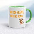 In Dog Years Mug A rude mug with "In Dog Years, You're Dead" on both sides. Simple and straight to the point this rude mug is great as a gift for any occasion. Our In Dog Years mug is hand-print...