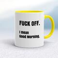 Fuck Off I Mean Good Morning Mug A rude mug with "Fuck Of.f I Mean Good Morning." printed on both sides. Simple and straight to the point this rude mug is great as a gift for any occasion. Our F...