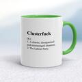 Clusterfuck Mug A rude mug with "Clusterfuck (n) 1. A chaotic, disorganised and mismanaged situation." and for 2. choose either the Labour Party or the Conservative Party or you can add your own...