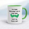 I'm A Vegan, You're A Cunt Mug A rude mug with "I'm A Vegan Which Means I Love All Living Things. Except You. You're A Cunt" printed on both sides. Simple and straight to the point this rude mug...