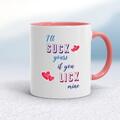 I'll Suck Yours Mug A rude mug with "I'll Suck Yours If You Suck/Lick Mine" printed on both sides. Simple and straight to the point this rude mug is great as a gift for any occasion. Our I'll Su...