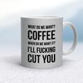 What Do We Want Coffee Mug A rude mug with "What Do We Want? Coffee When Do We Want It? I'll Fucking Cut You" printed on both sides. Simple and straight to the point this rude mug is great as a ...