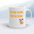 In Dog Years Mug A rude mug with "In Dog Years, You're Dead" on both sides. Simple and straight to the point this rude mug is great as a gift for any occasion. Our In Dog Years mug is hand-print...