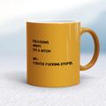 Reasons Why I'm A Bitch Mug A rude mug with "Reasons Why I'm A Bitch #1: You're Fucking Stupid." printed on both sides. Simple and straight to the point this rude mug is great as a gift for any ...